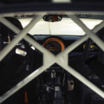 L’interno è ridotto all’essenziale; rimangono solo i sedili anteriori. L’area del guidatore consiste in un sedile certificato con cintura a sei punti approvata sia per le corse che per l’uso su strada, un volante con assorbitore d’urto in fibra di carbonio dal design minimalista e un quadro strumenti digitale. Il display informativo centrale lascia qui il posto a una copertura in fibra di carbonio per ridurre ulteriormente il peso. La console centrale ospita la leva del cambio, il freno a mano e i controlli per le luci di segnalazione necessarie – tutto in fibra di carbonio a vista. I pannelli delle porte in fibra di carbonio, altrettanto parsimoniosi, con finestrini e apriporta, contengono cinghie di tessuto per facilitare la chiusura delle porte. Un’altra caratteristica centrale dell’interno è il roll cage saldato, che massimizza la sicurezza. E anche il resto della ridotta struttura interna è verniciato nel tipico bianco da corsa (per motivi funzionali). L’assorbitore d’urto minimalista del volante e il pannello di spinta sul lato destro del volante sono componenti di alta qualità, fatti su misura, così come il rivestimento della console centrale e i pannelli delle porte sul lato del conducente. Un altro punto di forza sono i cuscinetti rimovibili sul sedile sportivo, anch’essi stampati in 3D, la cui struttura innovativa combina comfort, robustezza e modularità. Lo spessore, la durezza e il colore delle imbottiture possono essere adattati a seconda della fisionomia, del peso e del gusto personale del pilota.