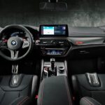 L’aspetto lussuoso e sportivo della BMW M5 CS ha ulteriori dettagli sia all’interno sia all’esterno. Il cofano, il diffusore anteriore, le calotte degli specchietti retrovisori esterni, lo spoiler posteriore, il diffusore posteriore, la copertura del vano motore M Power e il silenziatore di aspirazione sono realizzati in plastica rinforzata con fibra di carbonio (CFRP). Alcuni elementi sono in fibra di carbonio a vista. L’eccezionale esperienza di guida a bordo della BMW M5 CS può essere vissuta da quattro persone: il conducente e il passeggero anteriore avranno dei sedili M Carbon mentre i due passeggeri al posteriore hanno dei sedili individuali. I poggiatesta integrati – con loghi M5 illuminati per i sedili anteriori – presentano un profilo del leggendario circuito del Nürburgring. L’indicatore al centro con perforazioni rosse sul volante M Alcantara è un classico tocco da auto da corsa; il cambio è in fibra di carbonio. La vernice Frozen Deep Green Metallic della vettura che verrà consegnata al vincitore del BMW M Award sarà dello stesso colore della BMW M5 CS MotoGP Safety Car.