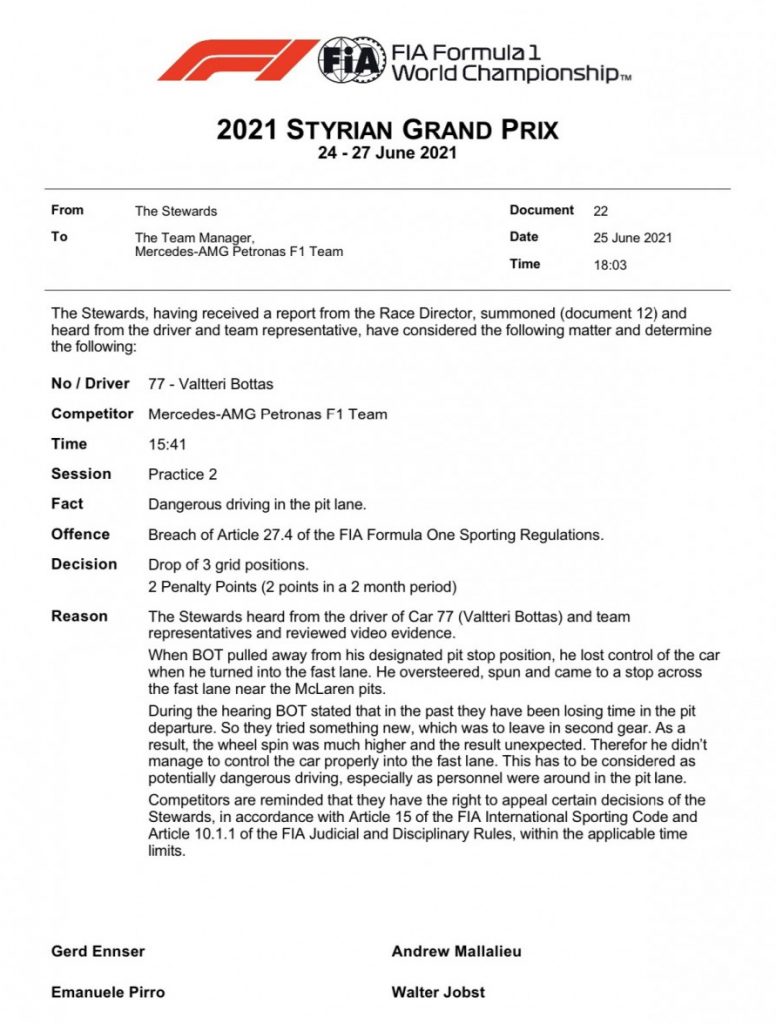 “Durante l’incontro, Bottas ha detto che in passato avevano perso tempo nella ripartenza dai box, quindi hanno provato qualcosa di diverso, ovvero partire in seconda marcia. Ma il pattinamento è stato molto più forte e il risultato inatteso, per cui non è riuscito a controllare la macchina. Un fatto considerato potenzialmente pericoloso, specie per la presenza del personale nella pitlane“, si legge nel comunicato FIA.