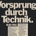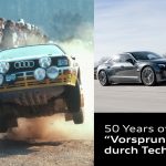 L’iconico claim Audi – All’avanguardia della tecnica – compie 50 anni. A mezzo secolo dalla creazione, non perde il proprio fascino e si conferma attuale in quanto espressione della costante propensione del brand all’eccellenza e all’innovazione. Un primato che, oggi, trova massima espressione nella gamma e-tron e nella progressiva decarbonizzazione dell’intera filiera produttiva. Nel 1969, Auto Union GmbH, con sede a Ingolstadt, e NSU Motorenwerke, con sede a Neckarsulm, diedero vita ad Audi NSU Auto Union AG. La gamma spaziava dai motori raffreddati ad aria della serie NSU Prinz a trazione posteriore ai propulsori a quattro cilindri raffreddati a liquido delle Audi 60 e Audi 100 a trazione anteriore, sino ad arrivare all’unità Wankel della futuristica NSU Ro 80. Nel 1970, Hans Bauer decise di valorizzare l’ampiezza del portfolio tecnologico, vantaggio competitivo nei confronti della concorrenza. Il Reparto Marketing Audi NSU ideò così il claim Vorsprung durch Technik – All’avanguardia della tecnica, giunto sino ai giorni nostri.