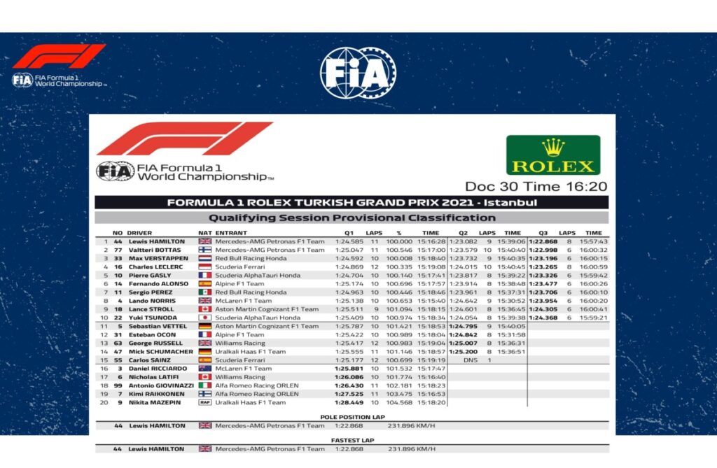 Il più veloce nelle qualifiche del GP di Turchia è stato Lewis Hamilton, che dovrà però scontare 10 posizioni di penalità per sostituzione del motore. In pole ci sarà quindi Valtteri Bottas, autore del secondo tempo, davanti alla Red Bull di Max Verstappen. La pioggia prevista si è vista solo nel Q1 ma la pista si è asciugata in fretta, con Hamilton davanti a Verstappen per soli 0.007s. Stessa leadership anche nel Q2, con un tempo di 1.22.868s – nuovo record sul giro all’Istanbul Park. Nel Q3 Bottas ha chiuso in P2 a 0.130s, con Verstappen a 0.328s. Quarto Charles Leclerc davanti all’AlphaTauri di Pierre Gasly, a mezzo secondo dalla pole.