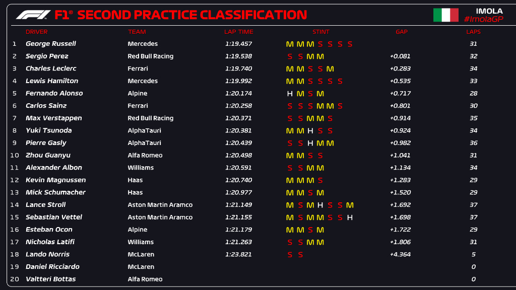 I piloti della Ferrari Charles Leclerc e Carlos Sainz hanno ottenuto rispettivamente il 3* e il 6° tempo nell’ultima sessione di prove libere del GP del Made in Italy e dell’Emilia Romagna. Entrambi si sono concentrati unicamente sui long run in preparazione della gara di 100 km che prenderà il via alle 16.30 e del Gran Premio vero e proprio che scatta domani alle 15. Charles e Carlos hanno iniziato il turno con un long run con due gomme di mescola diverse: Medium per il monegasco, che ha ottenuto come miglior tempo 1’21”776 (18 i giri completati), e Soft per lo spagnolo con un riferimento di 1’21”731 su un totale di 14 tornate. A metà sessione i due hanno invertito programma: Leclerc è andato in pista con la mescola Soft, con la quale ha ottenuto il suo tempo di riferimento in 1’19”740, mentre Sainz con la Medium si è a sua volta migliorato scendendo a 1’20”258. Nel complesso Charles ha completato 35 giri, Carlos 31. Il miglior tempo della sessione è stato fatto dal pilota della Mercedes George Russell, seguito dalla Red Bull di Sergio Perez. Quarto Lewis Hamilton e quinto Fernando Alonso. Solo 7° Max Verstappen. A chiudere la top 10 Tsunoda, Gasly e Guanyu. Appuntamento alle 16.30 per la mini-gara.