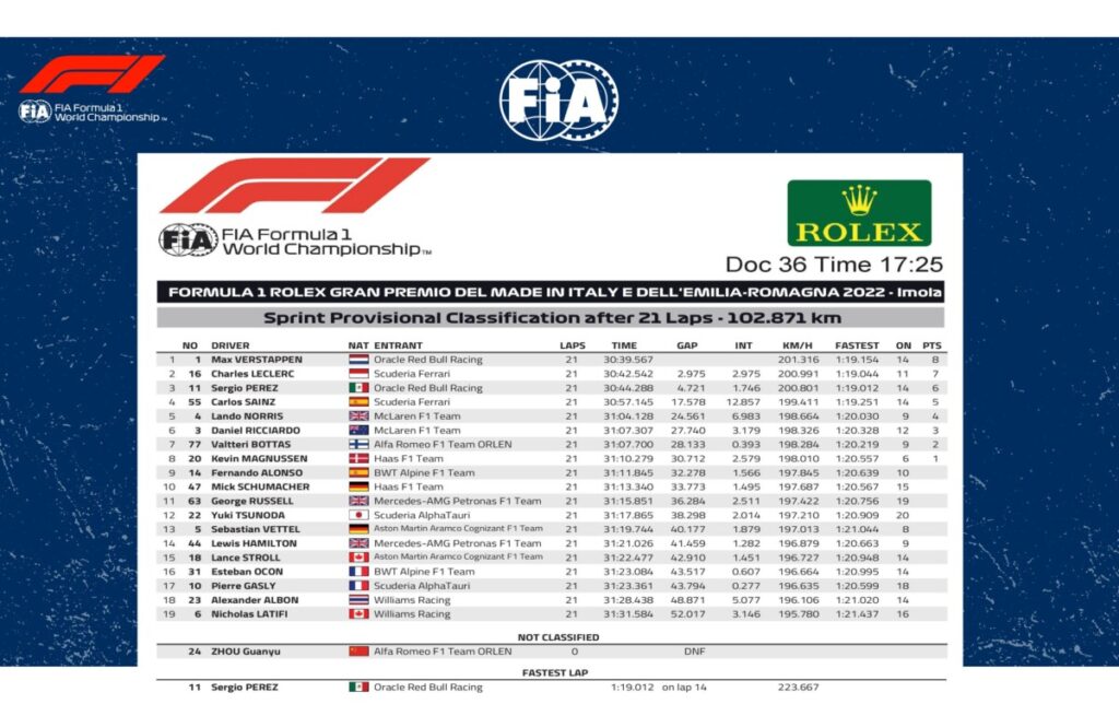 L’olandese non ha perso il contatto e sì è fatto vedere negli specchietti della Ferrari e a una manciata di giri dalla fine è entrato in zona DRS, mettendo a segno il sorpasso a due giri dalla fine, al Tamburello. A completare il podio Sergio Perez, che nei primi 10 giri ha guadagnato 3 posizioni e ha conquistato la terza piazza nel giro 11, passando Norris grazie al DRS. Quarta la Ferrari di Carlos Sainz, che ha recuperato 6 posizioni dopo essere partito 10° a causa dell’incidente in qualifica e ha passato la McLaren di Norris a due giri dalla fine. Sesto Daniel Ricciardo, davanti all’Alfa Romeo di Valtteri Bottas e alla Haas di Kevin Magnussen, che ha preso l’ultimo punto.