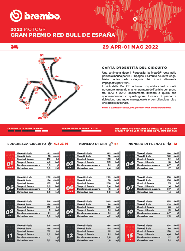 Una settimana dopo il Portogallo, la MotoGP resta nella penisola iberica per il GP di Spagna. Secondo i tecnici Brembo che lavorano a stretto contatto con il 100% dei piloti del Mondiale MotoGP, il Circuito de Jerez Angel Nieto rientra nella categoria dei circuiti altamente impegnativi per i freni. In una scala da 1 a 6 si è meritato un indice di difficoltà di 4, il più alto del primo terzo della stagione. I piloti della MotoGP vi hanno disputato i test a metà novembre, trovando una temperatura dell’asfalto compresa tra 16°C e 20°C, decisamente inferiore a quella che sperimenteranno in questi giorni. I cambi di pendenza richiedono una moto maneggevole e ben bilanciata, oltre che stabile in frenata.