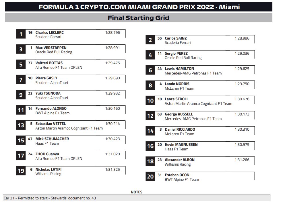 Alle 21.30 ora italiana il via del primo attesissimo GP di Miami. Un prima fila le Ferrari di Charles Leclerc e Carlos Sainz, seguiti dalle Red Bull di Max Verstappen e Sergio Perez, Poi l’Alfa Romeo di Valtteri Bottas e la Mercedes dell’ex-compagno di squadra Lewis Hamilton. Rispetto alle qualifiche, nessun cambiamento, ma la FIA ha dato l’ok a Esteban Ocon per prendere parte alla gara: nonostante non abbia disputato le qualifiche per l’incidente avuto nelle terze libere in cui ha danneggiato la sua Alpine, il francese si schiererà in griglia e partirà dall’ultima posizione. Buon divertimento e buon GP a tutti! QUI gli orari