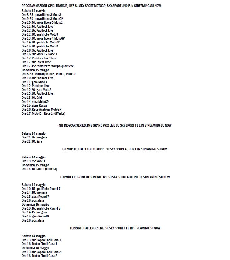 Ancora un weekend di motori da non perdere su Sky e in streaming su NOW: la MotoGP fa tappa a Le Mans per il GP di Francia – dove scende in pista anche la Moto E -, negli Stati Uniti si corre l’IMS Grand Prix per la NTT IndyCar Series, a Magny-Cours Valentino Rossi è al volante per il GT World Challenge Europe, il Ferrari Challenge è di scena a Le Castellet e a Berlino torna in pista la Formula E.