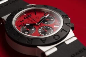 Una combinazione di eccellenza, performance e passione. Bulgari Aluminium Ducati Special Edition rivoluziona i canoni dell’orologeria sportiva di lusso. Il cronografo presenta un inedito quadrante rosso Ducati e tre contatori dallo stile sportivo ispirato alla grafica del contagiri Ducati: sfondo nero, indici bianchi, sfera rossa. Anche gli indici delle ore fanno riferimento all’estetica della casa motociclistica di Borgo Panigale.