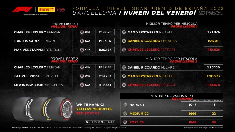Il pilota della Ferrari e leader di Campionato Charles Leclerc ha realizzato il miglior tempo di giornata nelle FP2 del GP di Spagna (1’19.670) precedendo i piloti della Mercedes George Russell e Lewis Hamilton, tutti e tre con pneumatici P Zero Red soft. Leclerc è stato anche il più veloce in FP1, questa volta davanti al compagno di squadra Carlos Sainz. Sono state utilizzate tutte e tre le mescole, con un run plan comune incentrato su P Zero White hard seguita dalla soft in FP1, e poi da P Zero Yellow medium seguita ancora dalla soft in FP2. Le condizioni sono state calde e asciutte per tutto il giorno e la sessione di FP2 è iniziata con una temperatura ambiente di 33 gradi e della pista di 45 gradi. Al momento, c’è un gap prestazionale stimato in circa 1,3 secondi tra la hard e la medium, e di 1,1 secondi tra la medium e la soft. In generale, il grado di evoluzione della pista a Barcellona non è particolarmente elevato.