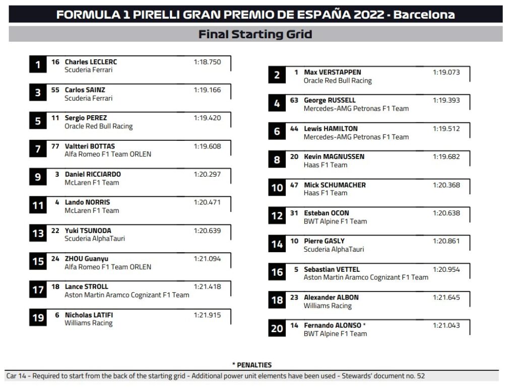Si segneranno alle 15.00 i semafori sul rettilineo del Circuit de Barcelona-Catalunya e prenderà il via il sesto round del campionato 2022, il GP di Spagna. Prima fila per i rivali in lotta per il Titolo Leclerc e Verstappen, seguiti da Sainz e Russell, con Perez e Hamilton in terza fila. Quarta per Bottas e Magnussen, seguiti da Ricciardo e Mick Schumacher a chiudere la top 10. Unica penalità per l’Alpine di Fernando Alonso, che dovrà partire da fondo griglia dopo la sostituzione di alcune parti della power unit. Prepariamoci a 66 giri tiratissimi, nell’infuocata Barcellona. Buon GP e buon divertimento a tutti, ricordandovi che la gara sarà in diretta in chiaro anche su TV8!