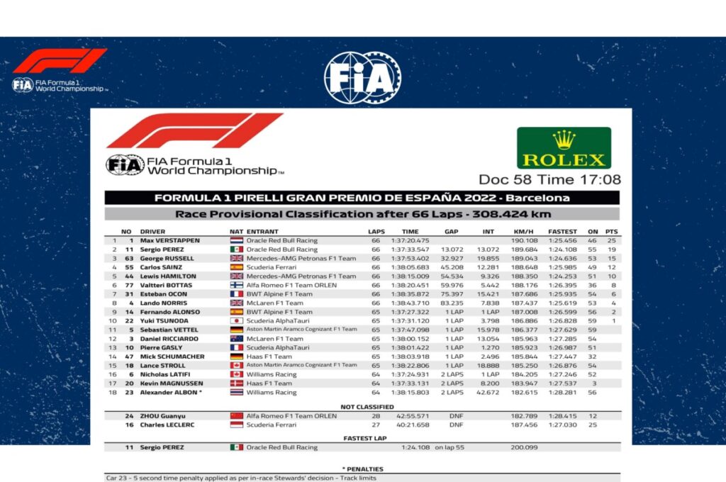 Spagna: doppietta e sorpasso Red Bull, terzo Russell. Leclerc out. Sainz 4°