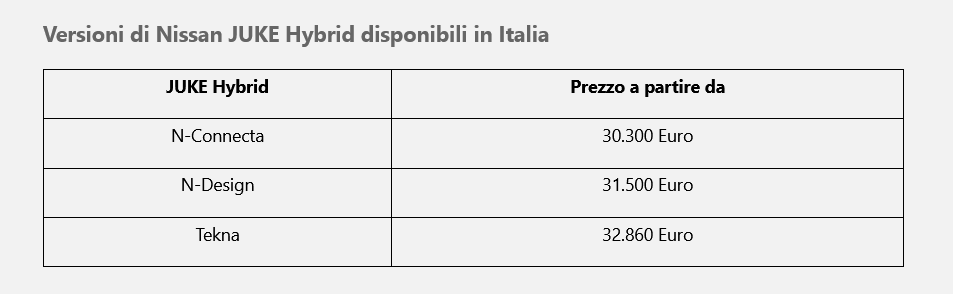 In questo scenario, Nissan si colloca con un’accelerazione molto forte verso un futuro di mobilità più sostenibile e JUKE rappresenta solo uno dei nuovi crossover elettrificati Nissan in arrivo nei prossimi mesi, in grado di soddisfare le esigenze di un ampio target di clienti. Nel 2023, Nissan avrà la gamma di crossover elettrificati più nuova e completa nel panorama automobilistico italiano, dal B-SUV JUKE al crossover coupé Ariya. Nel 2023, il peso delle vendite elettrificate del Marchio sarà pari al 75% e i clienti troveranno in Nissan una versione elettrificata per ogni modello in gamma. I clienti che cercano un crossover coupé dalle prestazioni brillanti, con bassi consumi e basse emissioni, oggi trovano in JUKE Hybrid la soluzione ideale. Con prezzi a partire da 30.300€ per l’allestimento N-Connecta, JUKE Hybrid beneficia degli incentivi governativi per le auto a basse emissioni, ovvero uno sconto di 2.000€ sul prezzo d’acquisto in caso di rottamazione di un veicolo (cat. M1) omologato in una classe inferiore a Euro 5. A partire dal 25 maggio 2022 è possibile ordinare JUKE Hybrid presso la rete di concessionarie Nissan, con le prime consegne previste a partire da settembre 2022.