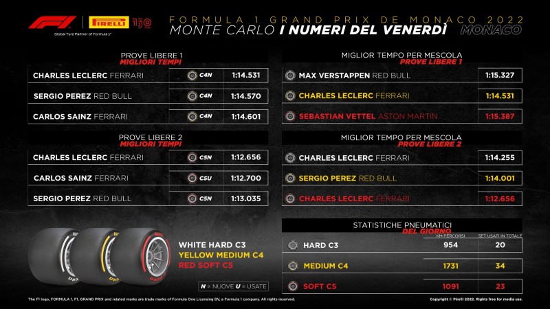 Monaco è il gran premio di casa per Charles Leclerc (Ferrari), che ha ottenuto il miglior tempo in entrambe le sessioni di prove libere montando P Zero Red soft in FP2 e P Zero Yellow medium in FP1. Le prestazioni dei pneumatici e i run plan del venerdì sono stati coerenti con le aspettative. Durante FP1, Ferrari è stata l’unico team a utilizzare solo le medium, mentre Williams e Aston Martin hanno utilizzato solo le soft. Nel pomeriggio, sono state scelte quasi esclusivamente medium e soft; solo Ferrari ha montato P Zero White hard per chiudere la sessione. Le condizioni sono state decisamente più calde rispetto all’ultimo gran premio di Monaco: la temperatura dell’asfalto oggi ha superato i 50 gradi. Questo ha contribuito a portare i pneumatici in temperatura, mentre, come capita spesso, l’usura e il degrado sono stati contenuti. La seconda sessione di prove è stata interrotta da una bandiera rossa – cosa abbastanza comune sulle strade tortuose del circuito cittadino di Monte Carlo – che ha ridotto il tempo a disposizione per le prove.