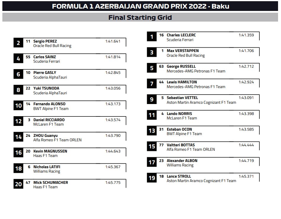 Tutto pronto a Baku per l’ottavo appuntamento del campionato del mondo 2022, il GP dell’Azerbaijan, che scatterà alle 13 ore italiana. Nessun cambiamento sulla griglia rispetto alle qualifiche di ieri: in prima fila il poleman Charles Leclerc e Sergio Perez, seguiti da Max Verstappen e Carlos Sainz. Terza fila per Russell e Gasly, seguiti da Hamilton e Tsunoda, Vettel e Alonso. Ultima fila per Stroll e Mick Schumacher. Che vinca il migliore come sempre, che sarà quello più veloce e competitivo, con la macchina più affidabile, col team più capace nelle strategie, ma che soprattutto saprà tenersi lontano da muri e barriere sullo strettissimo tracciato di Baku. Dal punto di vista egoistico, che sia una gara senza (troppe) bandiere rosse, così finiamo presto di scrivere e resta il tempo per vedere l’arrivo della 24 Ore di Le Mans! Buon GP e buon divertimento a tutti!