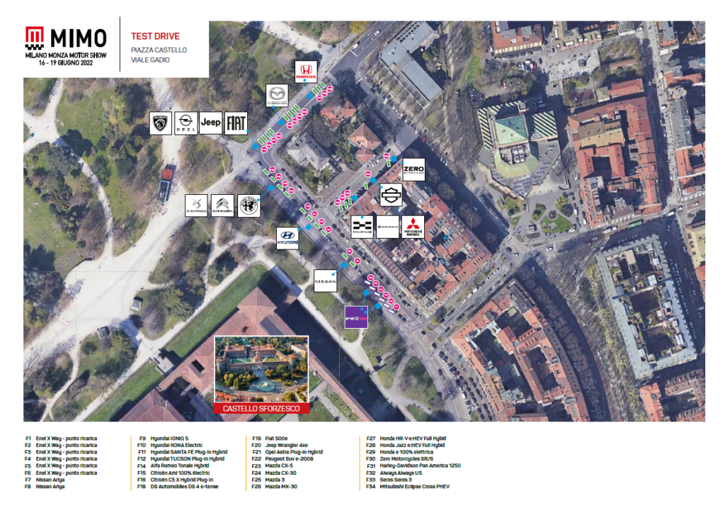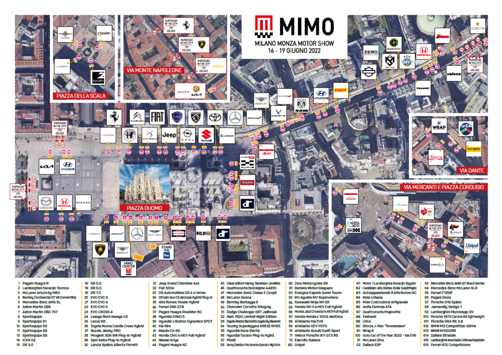 E’ stata ufficializzata la mappa dell’esposizione dei modelli della 2ª edizione di MIMO Milano Monza Motor Show, che si svolgerà dal 16 al 19 giugno, con orario prolungato dalle 9 alle 23 e accesso gratuito per il pubblico. Qui sotto le mappe con tutti i modelli che saranno esposti in piazza Duomo e nel centro di Milano, nei box dell’Autodromo di Monza e disponibili alla prova su strada nei test drive.