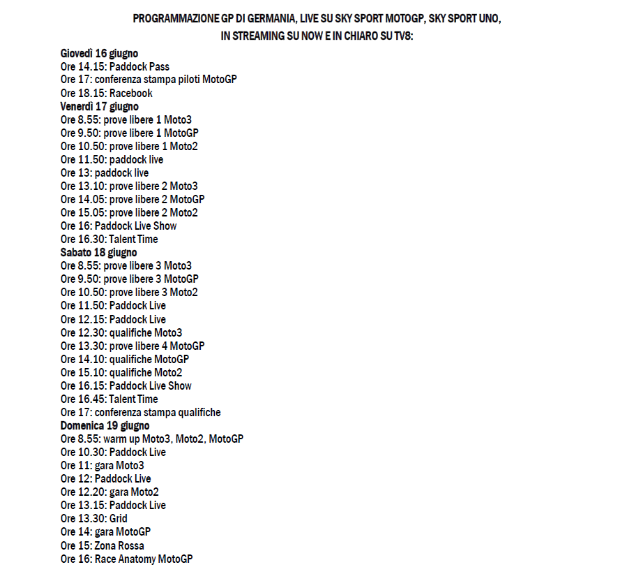 Da giovedì 16 e fino a domenica 19 giugno, tutti a Montreal per il GP del Canada in onda alle 20 su Sky Sport F1, Sky Sport Uno e in streaming su NOW. La MotoGP scende invece in pista al Sachsenring per il GP di Germania, con la gara in programma domenica alle 14 su Sky Sport MotoGP, Sky Sport Uno, in streaming su NOW e in chiaro su TV8. Nello stesso weekend, da non perdere anche gli appuntamenti con il Ferrari Challenge da Budapest e il GT World Challenge Europe da Zandvoort, in cui come sapete corre anche Valentino Rossi. Prepariamoci quindi a un altro fine settimana all’insegna dell’adrenalina.