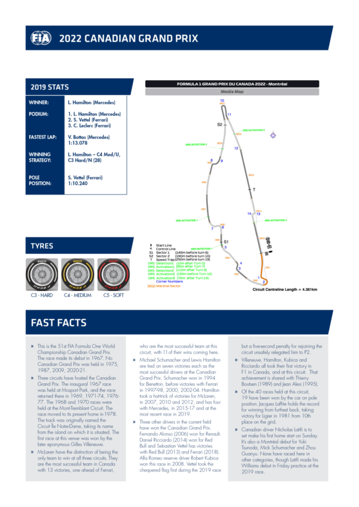 L’appuntamento di domenica sarà il 51* GP del Canada. La corsa è entrata in calendario per la prima volta nel 1967 e nella storia si è disputata su tre piste: Mosport Park (8 edizioni), Mont-Tremblant (2) e Montreal, che con 40 gare è ormai un appuntamento tra i più amati del Mondiale. Da percorrere ci sono 70 giri del circuito da 4.361 metri, pari a 305,27 km. Le prove libere del venerdì saranno alle 14 e alle 17 locali (20 e 23 CET), mentre la terza sessione sarà sabato alle 13 locali (19 CET), con le qualifiche saranno alle 16 (22 CET) e la gara domenica alle 14 (20 CET).