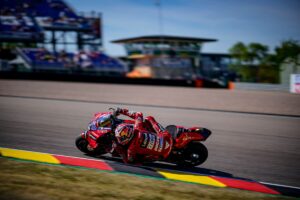 Francesco Bagnaia ha chiuso al comando il venerdì di prove libere del GP della Germania, decimo appuntamento della stagione MotoGP 2022, in programma questo fine settimana sul circuito del Sachsenring. Situato nei pressi della città di Chemnitz, il tracciato sassone non è mai stato uno dei più favorevoli alle caratteristiche della Desmosedici GP, ma i risultati del venerdì hanno invece dimostrato il contrario. Il pilota del Ducati Lenovo Team ha infatti preceduto altre due Desmosedici GP, con il pilota del VR46 Racing Team Luca Marini secondo e il compagno di squadra Jack Miller terzo. Già nella FP1 di questa mattina era stato proprio il pilota australiano a chiudere in prima posizione, precedendo Bagnaia di soli 15 millesimi. Nella FP2 del pomeriggio è stato invece il pilota italiano ha dettare il passo, firmando inoltre il nuovo record del circuito in 1:20.018 con la gomma morbida e staccando Marini di 115 millesimi e Miller di 193 millesimi.