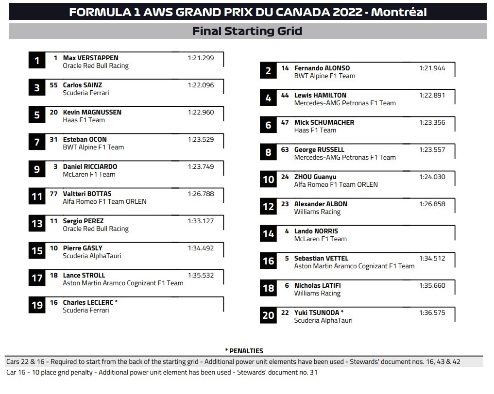 GP Canada 2022: la griglia di partenza ufficiale. QUI gli orari. Buon divertimento e buon GP a tutti!