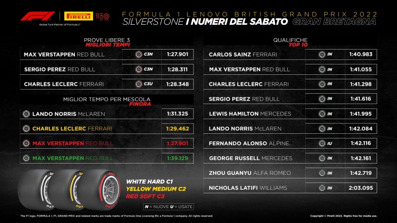 Il pilota della Ferrari Carlos Sainz ha conquistato la sua prima pole dopo una sessione di qualifiche disputata in condizioni di pioggia dall’inizio alla fine. I Cinturato Green intermediate sono stati utilizzati durante tutte le qualifiche, che si sono svolte con temperature ambiente attorno ai 15 gradi e 19 gradi la temperatura della pista. Nonostante le condizioni di bagnato anche intenso, le intermedie hanno fornito un’aderenza ottimale, con velocità massime vicino ai 300 km/h. A quella velocità i pneumatici intermedi evacuano circa 35 litri d’acqua al secondo, mentre i full wet disperdono circa 85 litri al secondo. Oltre a essere la prima pole position per Sainz, è stata anche la prima apparizione in Q3 per il pilota della Williams Nicholas Latifi. Il Pirelli Pole Position Award è stato consegnato a Sainz dal “leone inglese” Nigel Mansell, soprannominato così quando era pilota Ferrari. Mansell, iridato nel 1992, ha vinto quattro volte il GP di Gran Bretagna (oltre a un GP d’Europa disputato in Inghilterra).