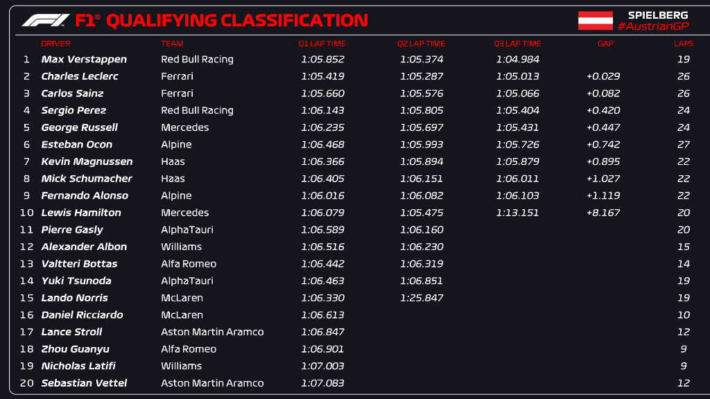 Dopo la seconda interruzione, è partita una lotta infuocata per la pole, con Verstappen che per l’ennesima volta ha dominato il Red Bull Ring nel suo ultimo run, mettendosi davanti a Charles Leclerc per soli 0.029s e a Carlos Sainz, terzo a 0.082s. Quarto Sergio Perez, con Russell 5° nonostante l’incidente. Ma sul messicano incombe il rischio di una penalità, perché nel Q2 ha superato i limiti della pista e se quel tempo fosse stato cancellato subito non sarebbe entrato in Q3, lasciando il posto a Pierre Gasly. Sesta l’Alpine di Esteban Ocon, col compagno di squadra Fernando Alonso 9°. Tra i due le Haas di Kevin Magnussen e Mick Schumacher.