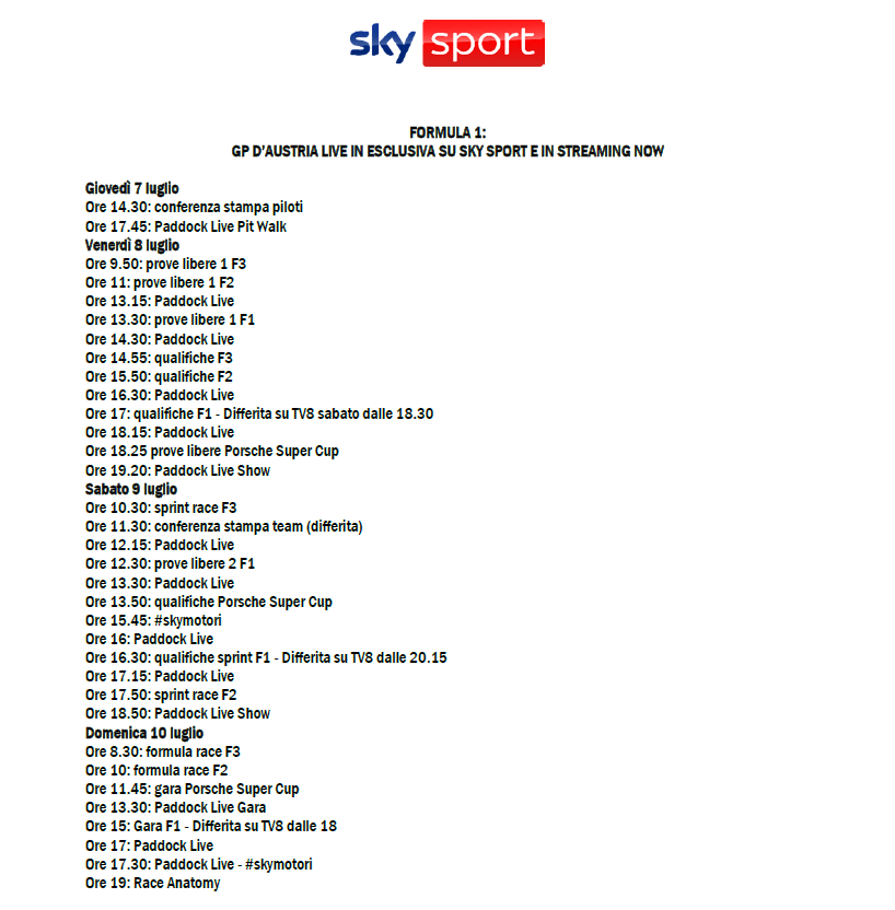 In arrivo su Sky e in streaming su NOW un altro fine settimana all’insegna dell’adrenalina, con la F1 in pista per il GP d’Austria al Red Bull Ring, undicesima tappa della stagione 2022. Da giovedì 7 a domenica 10 luglio, il weekend sarà in diretta esclusiva su Sky e in streaming su NOW. Gara in onda domenica 10 luglio, dalle 15.00, su Sky Sport F1, Sky Sport Uno e Sky Sport 4K. Differita su TV8 in chiaro dalle 18.00. In pista anche Formula 2, Formula 3 e Porsche Super Cup.