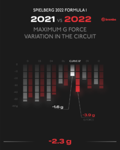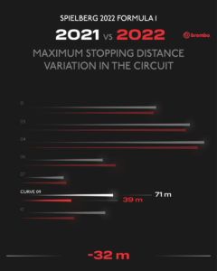 Brembo ci propone un’interessante comparazione delle prestazioni in frenata al GP d’Austria tra le monoposto di Formula 1 2021 e quelle 2022.