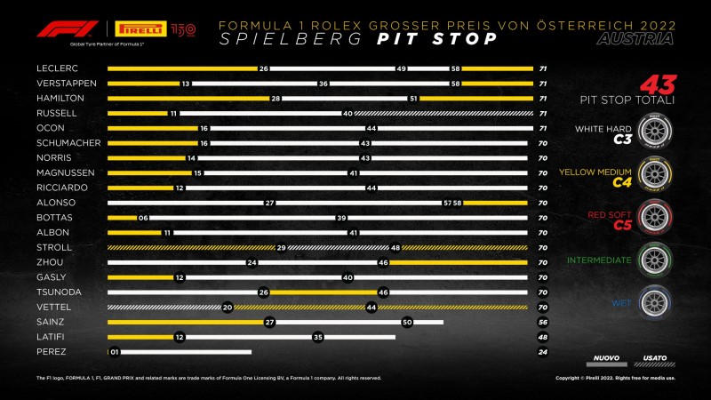 • La varietà delle strategie ha confermato l’eclettismo delle tre mescole portate a Spielberg: i piloti Mercedes sono arrivati terzo e quarto Russell con Medium, Hard, Hard mentre Hamilton ha preferito l’opzione di Charles e Max) con 3 strategie diverse viste sui primi quattro classificati