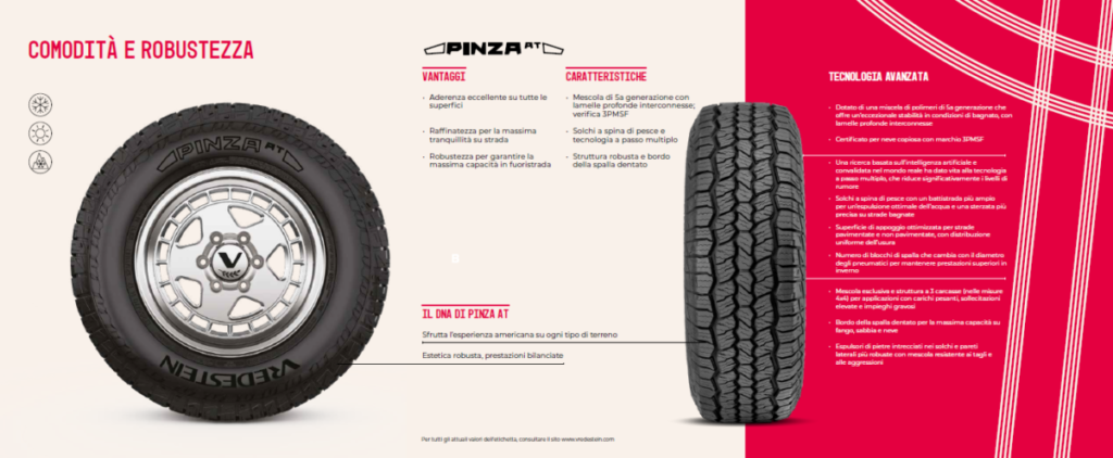 Grazie a caratteristiche che ne consentono l’utilizzo in tutte le stagioni e alla capacità di differenziarsi rispetto a molti altri prodotti del segmento All-Terrain, il modello Pinza ha ottenuto la certificazione “3-Peak Mountain Snowflake”, sinonimo di standard superiori in termini di aderenza e trazione su neve e superfici ghiacciate. Il nuovo pneumatico è stato progettato e sviluppato dal reparto interno di ricerca e sviluppo di Apollo Tyres, nei Paesi Bassi, utilizzando analisi simulate e test pratici in modo da ottenere un ottimale equilibrio delle caratteristiche prestazionali. Il modello Vredestein Pinza, che rappresenta il risultato del più ambizioso progetto di ricerca e sviluppo di prodotto effettuato nei 113 anni di storia del marchio, è stata testato in condizioni climatiche difficili, sia su strada sia in fuoristrada, in Nord America, Finlandia, Sud Africa e Medio Oriente. Lanciato negli Stati Uniti nel 2021, il pneumatico si è rapidamente affermato come uno dei prodotti più apprezzati nel competitivo segmento All-Terrain. Si tratta di uno dei quattro pneumatici All-Terrain raccomandati dalla prestigiosa agenzia di test indipendente, Consumer Reports.
