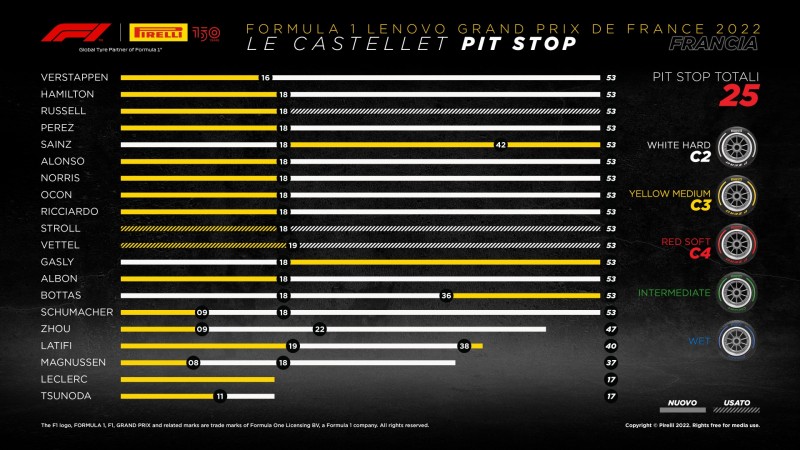 Max Verstappen vince il GP di Francia, settimo successo stagionale, effettuando un solo pitstop, passando dalle Medium alle Hard al 16° giro, un paio di run prima dell’ingresso della Safety Car, causata dall’uscita di pista di Leclerc. La maggioranza dei piloti ha approfittato dell’opportunità della presenza della SC per effettuare una sosta, per quasi tutti da Medium ad Hard, considerando che solo tre monoposto si erano presentate in griglia con le Hard. E proprio Carlos Sainz, uno dei tre su Hard, partito dalla 19° posizione per la penalità dovuta al cambio del motore, è riuscito a risalire fino al quinto posto, mettendo le Medium durante la SC e ancora le Medium a 11 giri dalla fine, uno dei pochi a effettuare due soste in gara. Le condizioni climatiche sono state caldissime come previsto, con un picco massimo di temperatura asfalto a 57°C.