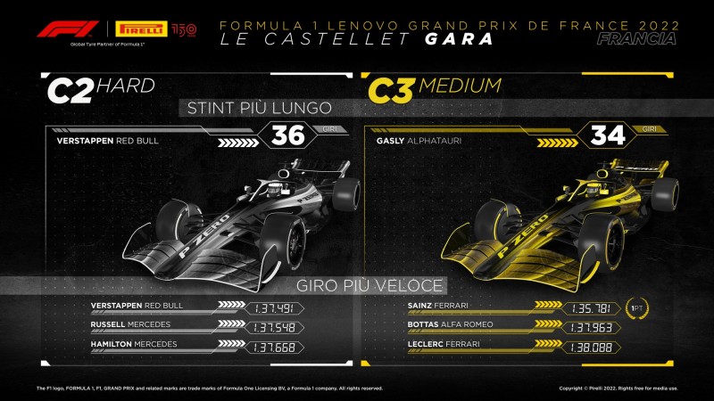 Max Verstappen vince il GP di Francia, settimo successo stagionale, effettuando un solo pitstop, passando dalle Medium alle Hard al 16° giro, un paio di run prima dell’ingresso della Safety Car, causata dall’uscita di pista di Leclerc. La maggioranza dei piloti ha approfittato dell’opportunità della presenza della SC per effettuare una sosta, per quasi tutti da Medium ad Hard, considerando che solo tre monoposto si erano presentate in griglia con le Hard. E proprio Carlos Sainz, uno dei tre su Hard, partito dalla 19° posizione per la penalità dovuta al cambio del motore, è riuscito a risalire fino al quinto posto, mettendo le Medium durante la SC e ancora le Medium a 11 giri dalla fine, uno dei pochi a effettuare due soste in gara. Le condizioni climatiche sono state caldissime come previsto, con un picco massimo di temperatura asfalto a 57°C.