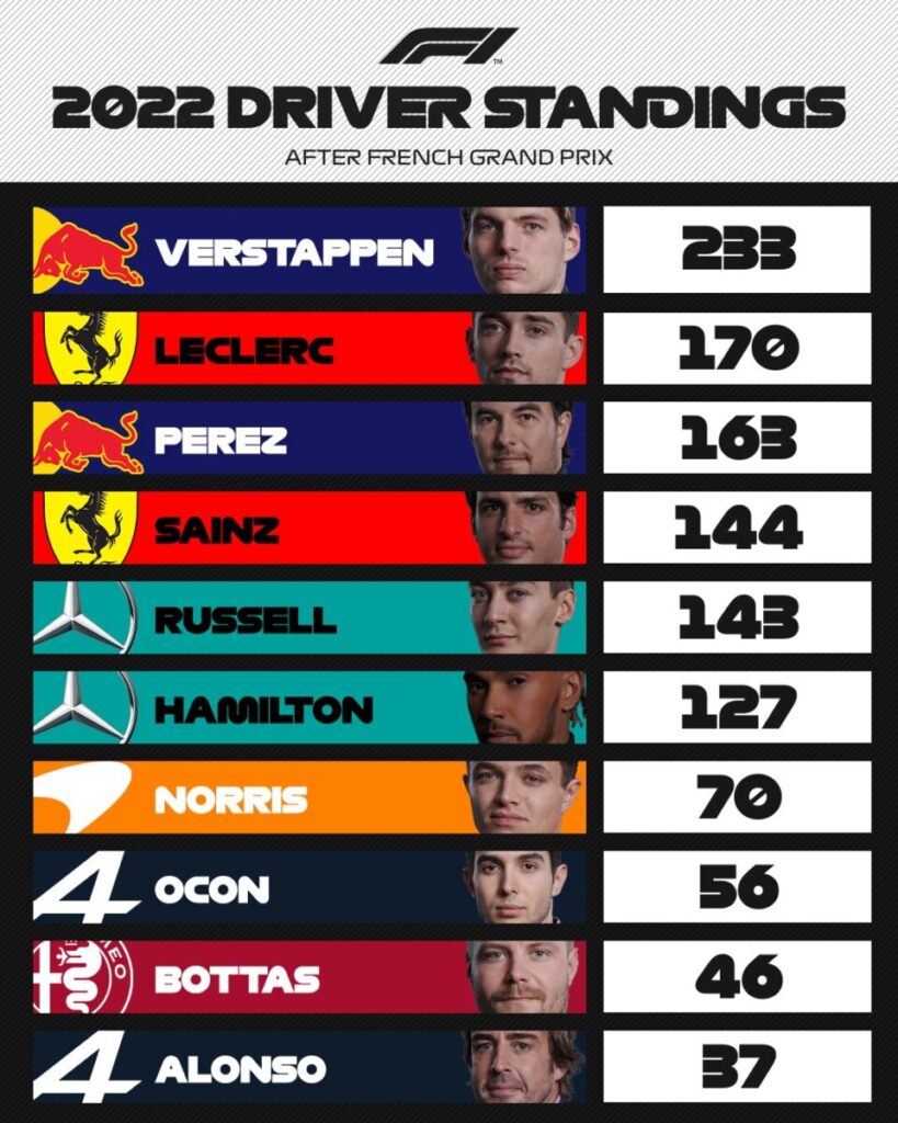 Nonostante ci siano ancora dieci gare in calendario, con il successo in Francia Max Verstappen ha messo prepotentemente le mani sul suo secondo Titolo: 63 punti di distacco da Leclerc sono veramente tanti. Sinceramente è un vero peccato perché siamo di fronte a una Ferrari vincente e competitiva, ma che deve ancora crescere per non commettere più questi errori. Anche domenica nel pitstop non sono stati perfetti e a farne le spese è stato un ottimo Carlos Sainz che è riuscito a rimontare fino alla quinta posizione finale compiendo due straordinari sorpassi ai danni di Russell e Ocon, passando all’esterno a Signes. Altrettanto bello il sorpasso su Perez, prima della sua ultima sosta.