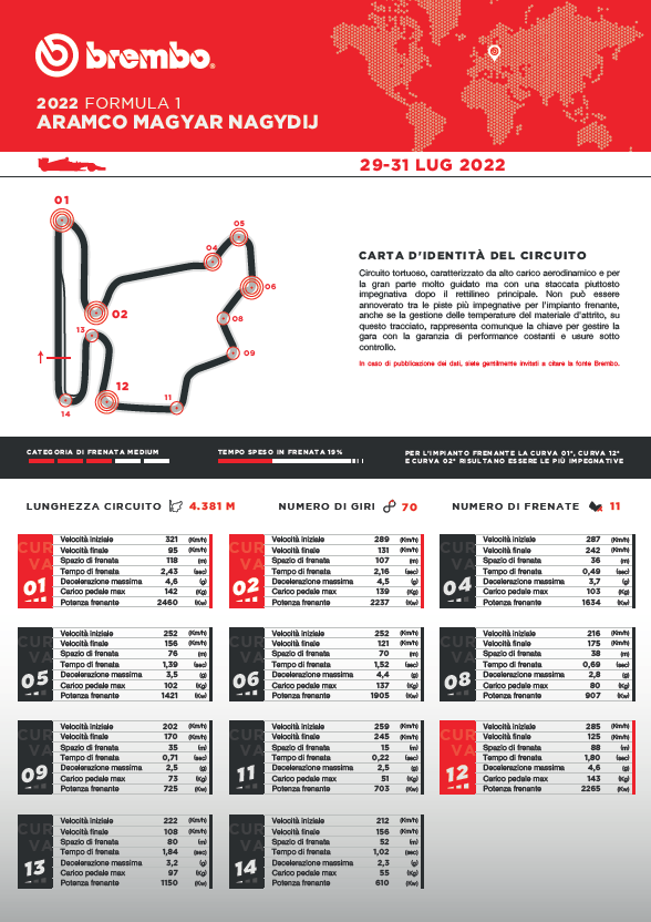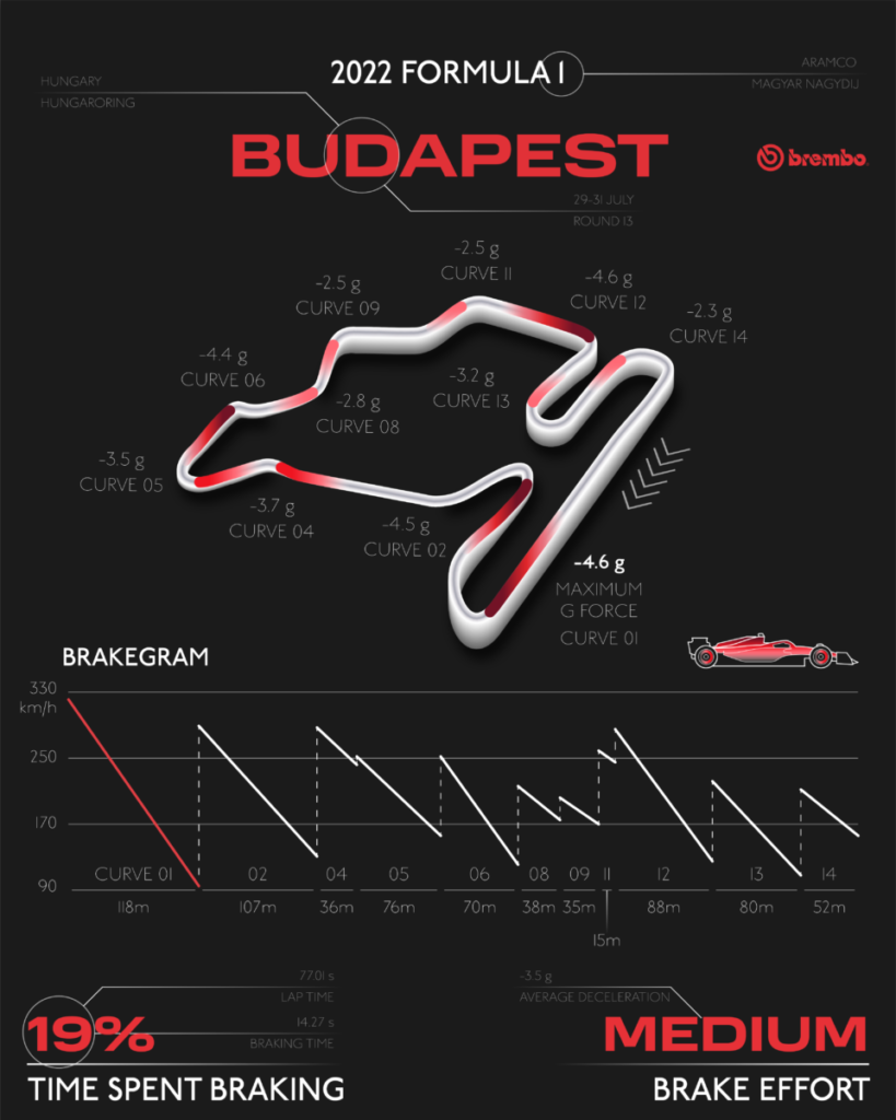 L’ultimo impegno prima della sosta estiva è il GP di Ungheria che per il 37° anno di fila va in scena all’Hungaroring. Secondo i tecnici Brembo questo circuito rientra nella categoria dei circuiti mediamente impegnativi per i freni. In una scala da 1 a 5 si è meritato un indice di difficoltà di 3. La tortuosità del tracciato lo fa somigliare ad un grande kartodromo e si ripercuote sulla velocità media sul giro, inferiore ai 205 km/h in gara mentre in qualifica ci si può spingere fino a 214 km/h. L’assenza di lunghi rettilinei, fatta eccezione per quello principale che però supera di poco i 900 metri, ostacola il raffreddamento dei freni ma d’altra parte è punteggiato da poche staccate dure.
