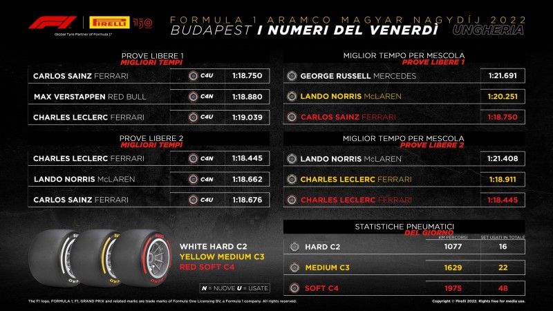 Grazie ai tempi di Carlos Sainz e Charles Leclerc, rispettivamente i più veloci in FP1 e FP2, la Ferrari è stata la più veloce nelle prove libere in Ungheria. Entrambi i piloti hanno girato con P Zero Red soft. La giornata è stata asciutta e calda, solo leggermente più fresca dello scorso weekend in Francia. Tuttavia, sabato le condizioni saranno molto diverse, con pioggia battente prevista sia per FP3 sia per le qualifiche. Venerdì la soft è stata la gomma più sfruttata, ma tutte e tre le mescole sono state utilizzate ampiamente in entrambe le sessioni. Il pomeriggio ha riservato ottimi risultati per la McLaren, con Lando Norris secondo pilota più veloce in FP2 e Daniel Ricciardo con il quinto miglior tempo. Attualmente il gap stimato tra P Zero White hard e P Zero Yellow medium è di circa 0,9 secondi, mentre circa 0,6 secondi separano la medium dalla soft. Questo secondo gap, in particolare, cambierà a seconda delle temperature dell’asfalto: più scenderanno, più la soft sarà favorita.