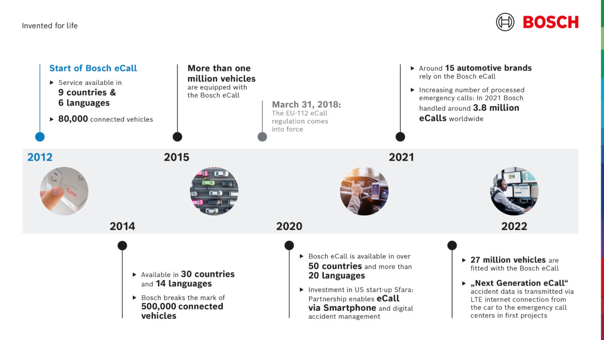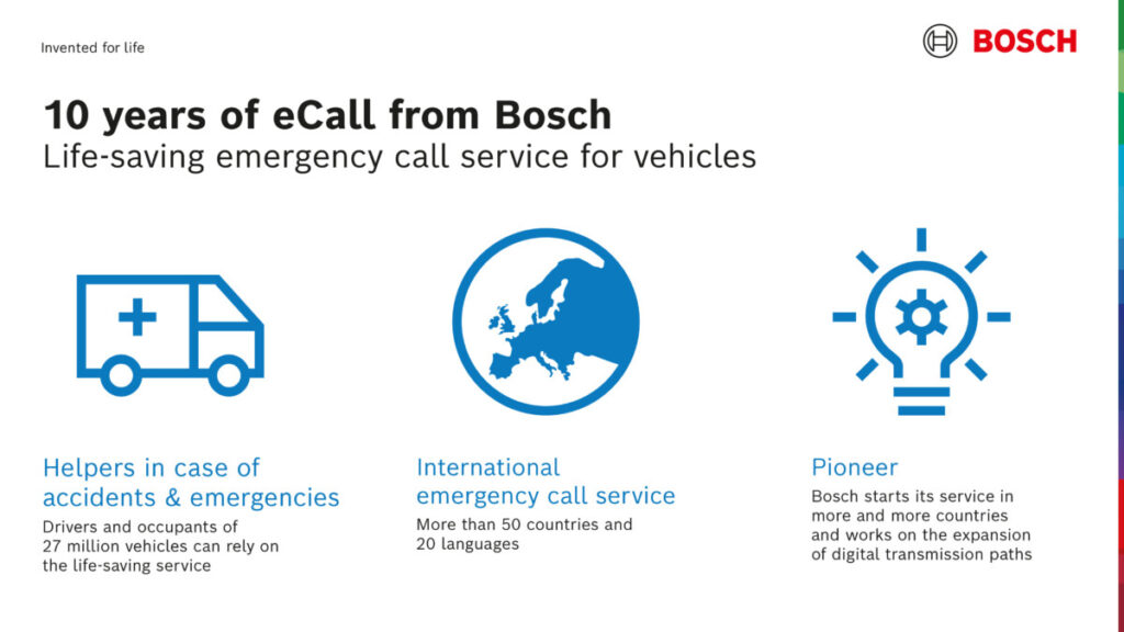 Mentre nel 2012 il servizio di chiamata d’emergenza Bosch prevedeva ancora una combinazione tra computer di bordo e telefono cellulare del conducente, nel 2014 è arrivata l’integrazione standard per le auto Mercedes-Benz. Da allora, la tecnologia è stata integrata nel modulo di infotainment permettendo di rilevare un impatto, di far partire una chiamata e di trasmettere i dati. Bosch ha creato una rete internazionale di centri di assistenza per il servizio eCall, attraverso un’infrastruttura informatica completa. Questi includono reti di partner con collegamenti ai centri di controllo dei soccorsi, ai vigili del fuoco e agli ospedali. Bosch ha sviluppato elevati standard di Bosch eCall sulla base di anni di esperienza nella gestione degli allarmi e delle chiamate di emergenza.