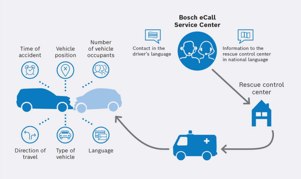 Mentre nel 2012 il servizio di chiamata d’emergenza Bosch prevedeva ancora una combinazione tra computer di bordo e telefono cellulare del conducente, nel 2014 è arrivata l’integrazione standard per le auto Mercedes-Benz. Da allora, la tecnologia è stata integrata nel modulo di infotainment permettendo di rilevare un impatto, di far partire una chiamata e di trasmettere i dati. Bosch ha creato una rete internazionale di centri di assistenza per il servizio eCall, attraverso un’infrastruttura informatica completa. Questi includono reti di partner con collegamenti ai centri di controllo dei soccorsi, ai vigili del fuoco e agli ospedali. Bosch ha sviluppato elevati standard di Bosch eCall sulla base di anni di esperienza nella gestione degli allarmi e delle chiamate di emergenza.