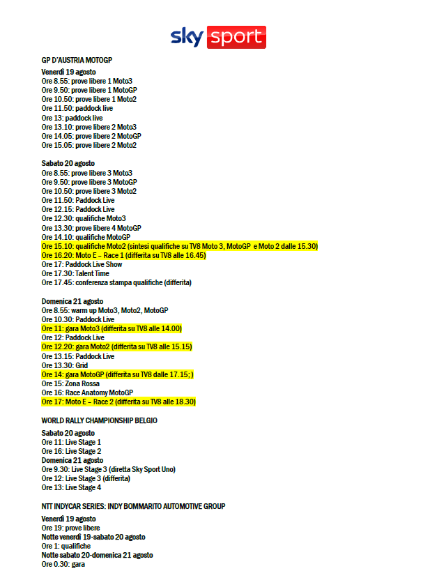 Da giovedì 18 a domenica 21 agosto, appuntamento con il Motomondiale dal Red Bull Ring a Spielberg, in Stiria, per il GP d’Austria in diretta esclusiva su Sky Sport MotoGP e in streaming su NOW. Domenica la gara della MotoGP alle 14 (Moto3 alle 11 e Moto2 alle 12.20) live su Sky Sport MotoGP, Sky Sport Uno e in streaming su NOW, con il commento di Guido Meda e Mauro Sanchini. Nel weekend, da non perdere anche il World Rally Championship in Belgio (diretta su Sky Sport Action e Sky Sport Uno) e la NTT Indycar Series con l’Indy Bommarito Automotive Group 500 (live su Sky Sport F1).