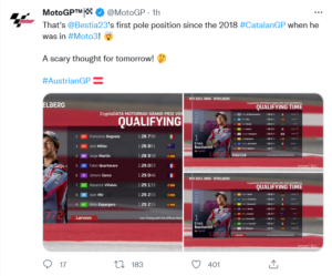 POLE POSITION FOR THE BEAST! 🔥@Bestia23‘s first in the premier class! 👏#AustrianGP 🇦🇹 pic.twitter.com/8oAUnFxDHL