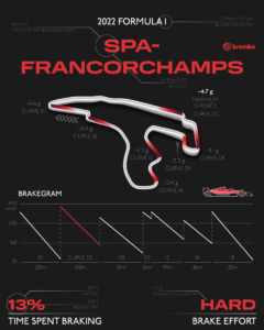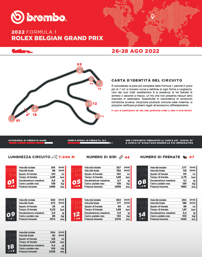 Dopo quattro settimane di sosta, il Campionato del Mondo di F1 riparte dal Belgio per il primo di tre GP in altrettanti weekend. Secondo i tecnici Brembo, il Circuit de Spa-Francorchamps rientra nella categoria dei circuiti impegnativi per i freni. In una scala da 1 a 5 si è meritato un indice di difficoltà di 4. È considerata la pista più completa della Formula 1 perché in poco più di 7 km si trovano curve e rettilinei di ogni forma e lunghezza. Uno dei suoi tratti caratteristici è la presenza di tre frenate di almeno 2 secondi e mezzo, un tris che non presenta nessun altro tracciato in calendario.
