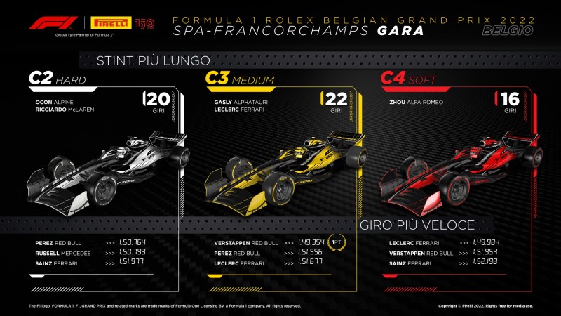 Tante le strategie viste in pista, con i primi tre piloti che ne avevano tre diverse. Sergio Perez, a differenza di Verstappen, non ha utilizzato le Soft, iniziando con le medie, cambiando ancora con le medie e quindi affrontando lo stint finale sulle hard. Carlos Sainz, partito in pole con le Soft, ha mantenuto la Ferrari al comando fino al giro 12, utilizzando tutti e tre i compound per arrivare sul terzo gradino del podio. In totale 16 monoposto hanno effettuato due soste con due soli piloti che si sono fermati tre volte. Prossima fermata Zandvoort, per il GP di Olanda, secondo round della tripletta, che dista circa 300 km da Spa, ovvero una delle distanze più corte fra due gare nel Mondiale per l’intero Circus della F1. Circa sei ore di strada che Pirelli affronta con un convoglio di 12 camion.