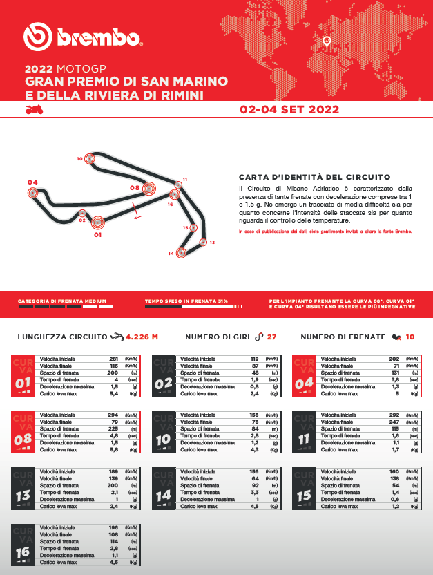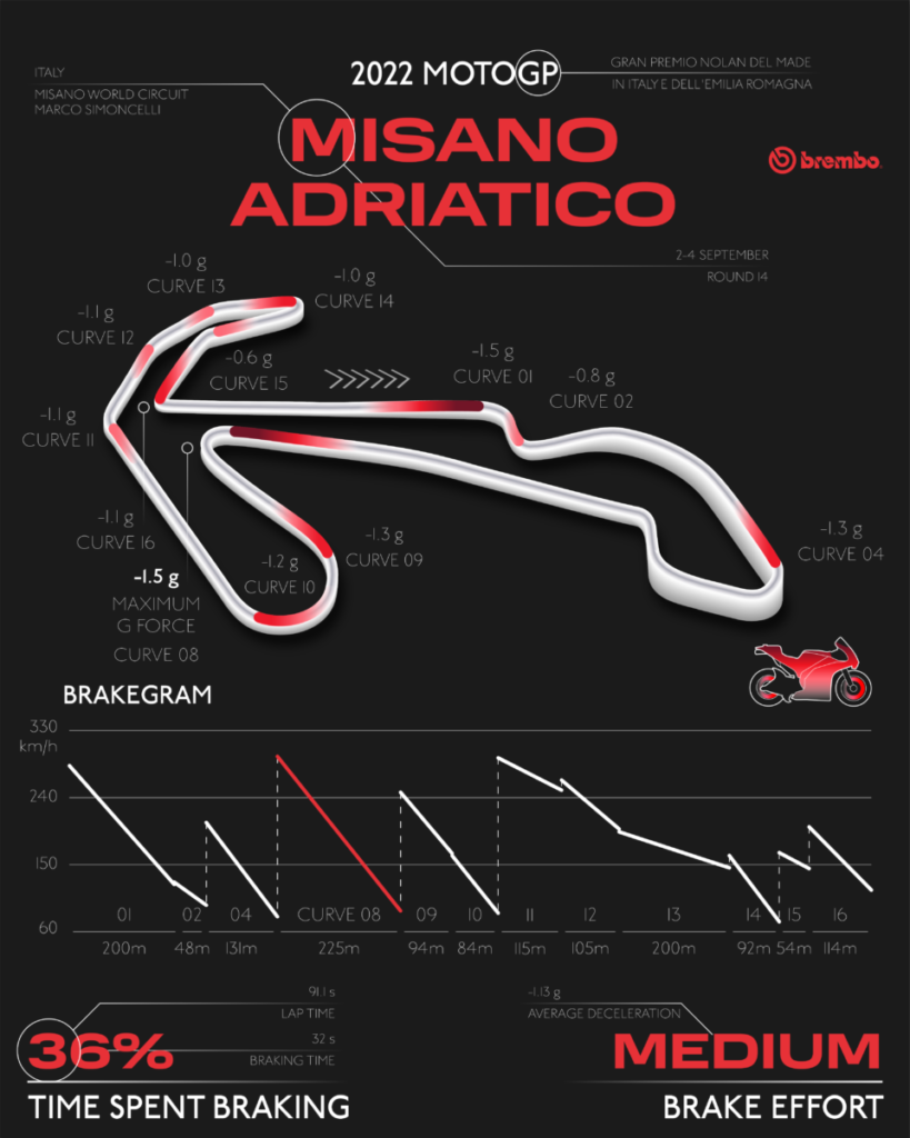 In 10 curve del tracciato di Misano i piloti della MotoGP utilizzano i freni per un valore complessivo sul giro di 29 secondi, pari al 31 per cento della durata della gara. Anche per la Superbike che qui ha gareggiato a giugno le staccate sono 10, ma le loro velocità di punta sono inferiori di una trentina di km/h e i tempi sul giro superiori di oltre 3 secondi. Le tre frenate più dure del tracciato sono però le stesse per le due categorie e sono tutte comprese nelle prime 8 curve. Oltre alla curva 8, anche alla curva 1 lo spazio di frenata è di almeno 200 metri e la decelerazione di 1,5 g. Significativi anche i valori della curva 4: il carico sulla leva del freno Brembo è di 5 kg e la pressione del liquido frenante di 10,7 bar.