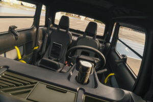 Con lo stesso intento, tre frecce bianche posizionate una sotto l’altra nel pannello della porta ne indicano la direzione di apertura. Sulla parte inferiore (apribile) dei vetri dei finestrini, un adesivo indica la longitudine che corrisponde alle coordinate GPS del centro tecnico del Gruppo Stellantis, l’ADN (Automotive Design Network) situato a Vélizy. Inoltre, due piccoli dettagli estetici ricordano che My Ami Tonic è un oggetto di mobilità completamente elettrico, un adesivo « + » sulla maniglia della porta del conducente e uno « – » su quella della porta del passeggero simboleggiano le polarità di una pila.