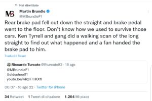 Twitter a volte sa ancora sorprenderti e ci ricorda il motivo per cui è nato: condividere esperienze e poter seguire persone e argomenti a cui si è interessati. Il perché Twitter spesso non sia più così lo sappiamo tutti. E’ così che un giorno ti capita di postare un video oldschool di F1 e a risponderti è il diretto interessato. In questo caso parliamo di Martin Brundle. Sì, proprio l’ex pilota britannico ora apprezzatissima voce della F1 d’Oltremanica ai microfoni di Sky. Il video riporta un incidente che lo vide coinvolto a Imola nel 1984 a bordo della Tyrrell 012. Diciamoci la verità, la 012 ha sempre fatto impressione anche in quegli anni a guardarla per come il pilota rimaneva esposto dall’abitacolo.