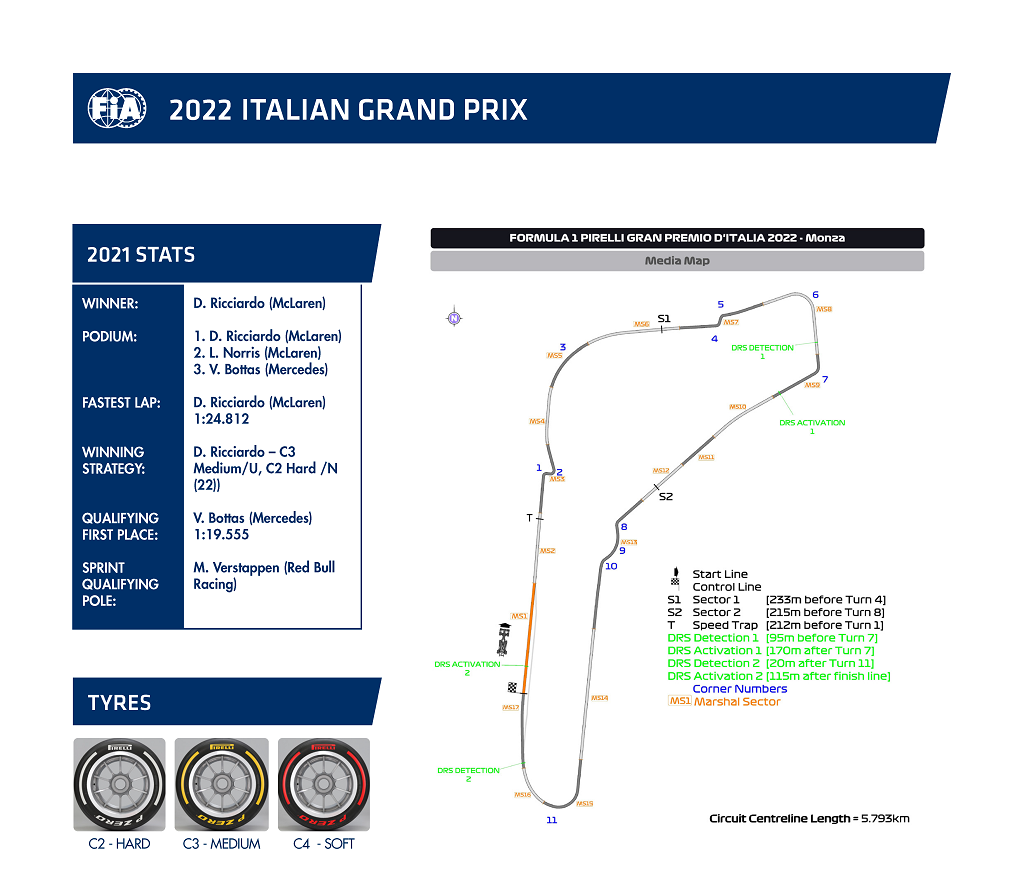 Le vetture avranno un basso carico aerodinamico al fine di massimizzare la velocità sui rettilinei. L’assetto sarà fondamentale per girare veloci e poter sorpassare, ma nella messa a punto bisognerà prestare attenzione anche a non sacrificare troppo la trazione. Due le zone DRS: sul rettilineo principale e tra la seconda curva di Lesmo e la variante Ascari; 53 i giri da percorrere, pari a 306,72 km.