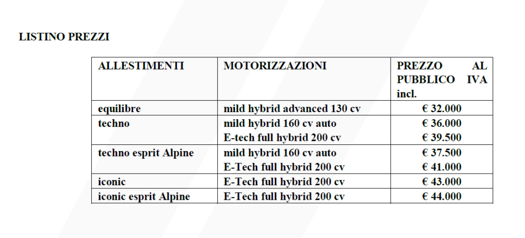I prezzi partono da 32.000€ per le versioni con equilibre mild hybrid advanced 130 cv. Il cuore di gamma è la versione techno E-tech full hybrid, a un prezzo da 39.500€, disponibile con finanziamento Valore Futuro Renault a partire da 300€ al mese.