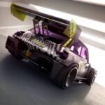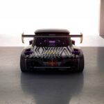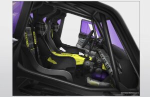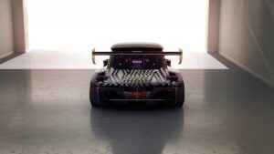 Riprendendo le forme del cofano, le porte nonché l’abitacolo della sua antenata – ma, stavolta, con la carrozzeria in fibra di carbonio, R5 TURBO 3E dichiara a quale stirpe appartiene, ma lo fa con esuberanza. Rivisita anche le iconiche prese d’aria della Turbo 2 sui parafanghi posteriori, vantando così una larghezza di 2,02 metri (25 centimetri in più dell’antenata), per una lunghezza di 4 metri e un’altezza di 1,32 metri. Il punto di forza è l’immenso alettone posteriore, che le consente di rimanere incollata al suolo anche nelle derapate più estreme.