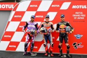 Dopo tre anni, Marc Marquez torna in pole e lo fa sul bagnato nel GP del Giappone. Al secondo GP dal suo ritorno dopo l’ultima operazione al braccio destro, che l’ha tenuto lontano dalla RC213V per oltre tre mesi, l’otto volte iridato del Repsol Honda Team domani partirà davanti a tutti, per la 91° volta in MotoGP.