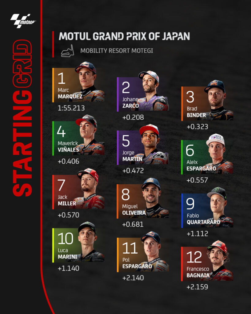 Dopo un ritardo di 90 minuti sul programma causa pioggia, il campione del Repsol Honda Team ha fatto un tempo di 1:55.214 conquistando la prima pole dal Giappone 2019, davanti a Johann Zarco (Prima Pramac Racing) e Brad Binder (Red Bull KTM Factory Racing). Nessuno dei piloti in lotta per il Titolo ha fatto meglio del sesto posto: Aleix Espargaro (Aprilia Racing), Fabio Quartararo (Monster Energy Yamaha MotoGP Team) e Francesco Bagnaia (Ducati Lenovo Team) sono infatti fuori dalle prime due file, rispettivamente 6°, 9° e 12°.
