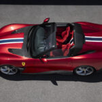 Uno degli elementi che catturerà l’attenzione di chi si avvicina alla SP51 è il Rosso Passionale, nuovo colore triplo strato sviluppato appositamente per questa vettura. Tale tonalità dona infatti all’auto un carattere elegante e autorevole, la cui personalità viene ulteriormente esaltata dalla livrea longitudinale bianca e blu ispirata a una leggendaria Ferrari 410 S del 1955 ma che, in questa interpretazione, attraversa la vettura fino a penetrarvi all’interno.