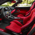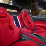 Di grande impatto anche la finitura speciale prevista per i pannelli porta, la parte inferiore della plancia e i fianchetti dei sedili, composta da un inserto in Kvadrat® blu con cuciture a ‘X’ bianche che riprende il pattern della livrea. Il generoso utilizzo di finiture in fibra di carbonio a effetto lucido ben si armonizza con le finizioni di color Nero Momo Opaco. Alcuni dettagli ricamati in bianco (tra cui i cavallini e il logo della vettura, presente peraltro anche sull’arco inferiore del volante) completano un insieme di grande eleganza e prestigio.