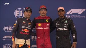 Nella lotta per la pole, ad avere la meglio è stato Leclerc, con i tempi di tutti che scendevano man mano che aumentava il grip. Il suo tempo di 1.49.412s ha messo dietro Perez di soli 0.022s e Hamilton di 0.054s. Max Verstappen ha dovuto abortire l’ultimo run quando è stato richiamato ai box dalla Red Bull, cosa che non ha affatto preso bene come da team radio, e scatterà quindi dall’8° posto. Quarto crono per Carlos Sainz, seguito dall’Alpine di Fernando Alonso, dalla McLaren di Lando Norris e dall’AlphaTauri di Pierre Gasly. Dietro a Verstappen, la Haas di Kevin Magnussen e Yuki Tsunoda a chiudere la top 10. Undicesimo George Russell che non è riuscito a tenere il passo del compagno di squadra. Tra le Aston Martin di Lance Stroll e Sebastian Vettel la seconda Haas di Mick Schumacher, 13°, con Zhou Guanyu 15°. Fuori nel Q1 Valtteri Bottas grazie al tempo fatto da Schumacher, con Daniel Ricciardo per la terza volta eliminato subito, 17°, seguito da Esteban Ocon, davanti alle Williams di Alex Albon e Nicholas Latifi.